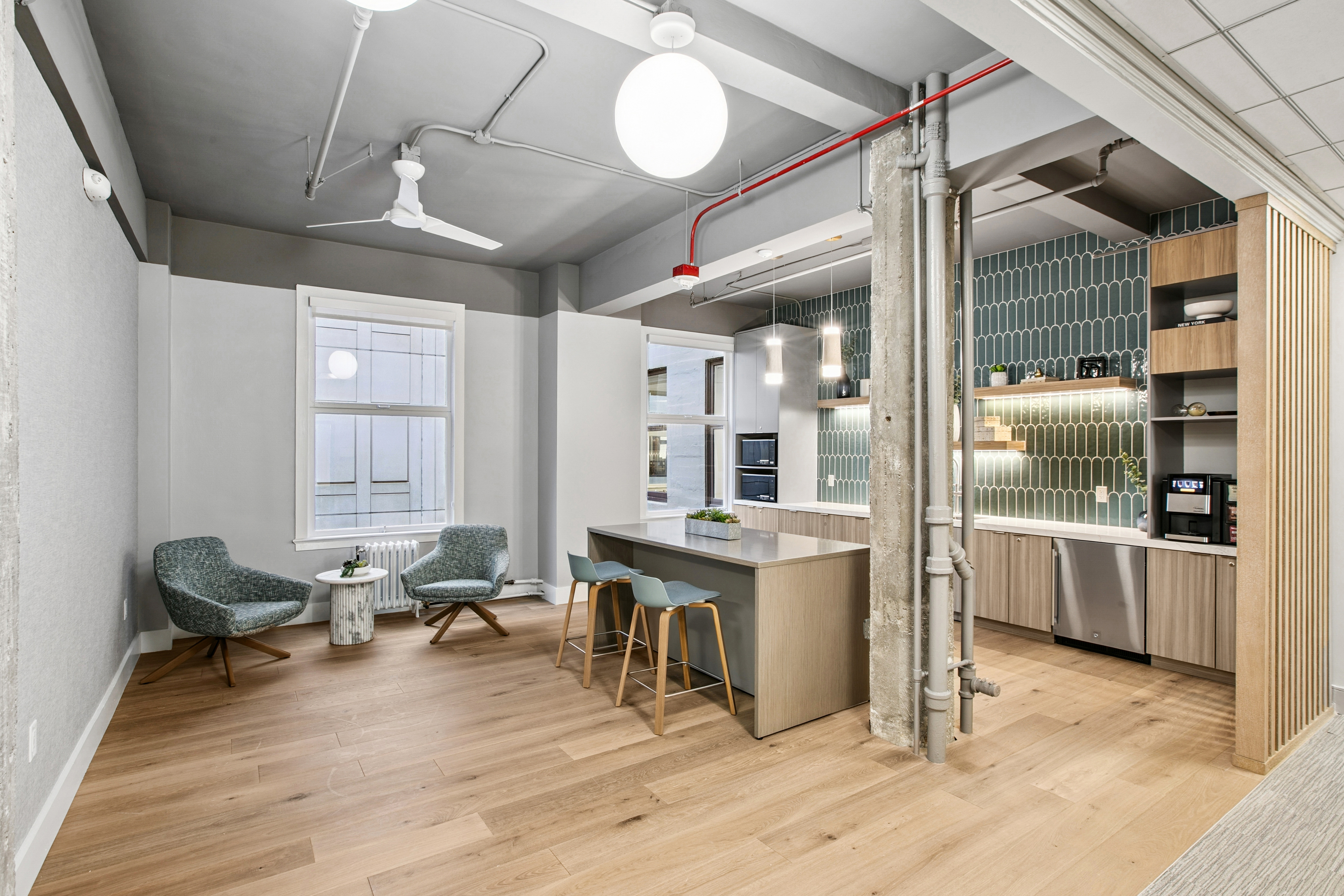 A single office like this offers a simple, plug & play setup. The room includes its own sink, which can be useful for a range of work needs. Wi‑Fi is provided, and the office is located directly across from a shared conference room and tenant lounge, giving you easy access to meeting space and common areas. It’s a practical option for someone looking for a straightforward place to work.
